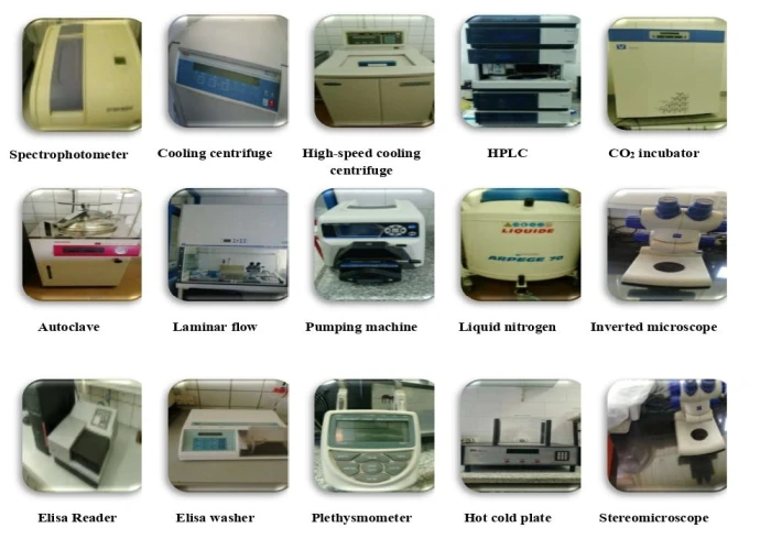 Electronic balances, water baths, microscopes, centrifuges, oven, spectrophotometers, autoclave, water distillator, high-speed centrifuge, pumping machines, liquid nitrogen, ELISA reader, tissue homogenizers, sonicator, three vertical deep freezers (-30°C & -80 °C), two laminar flow, two CO2 incubator, cooling centrifuge, inverted microscope and two HPLC, plethysmometer and hot cold plate. Since 2009, Pharmacology Department has established a new unit (in place of one small laboratory) under the name “Drug Evaluation and Discovery Unit (DEDU)” (under supervision of Prof. Sanaa Botros). Pharmacology Department and its unit has been assigned (2011) by WHO-ANDI an excellence center on antitrematodal R&D.