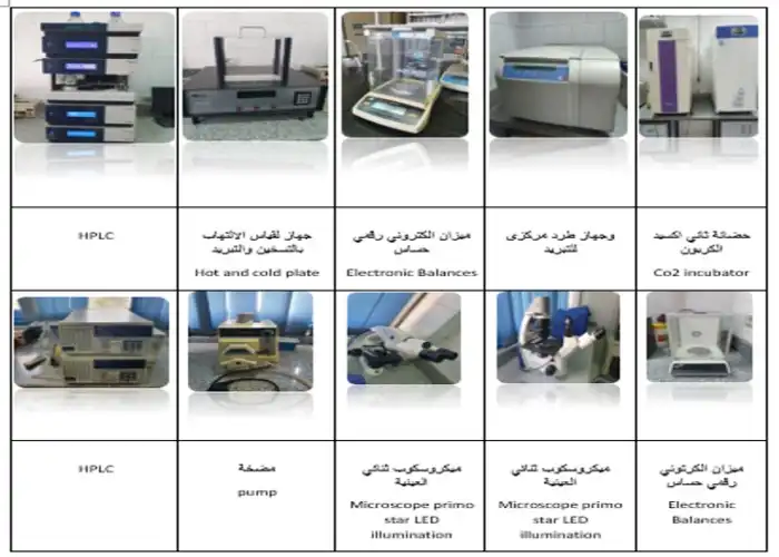 Two laminar flow hoods, two CO2 incubators, a cooling centrifuge, peristaltic pumping machines, inverted and stereo microscopes, electronic balances, water baths, research binocular microscopes, spectrophotometers, an autoclave, a cooling centrifuge, a liquid nitrogen container, a sonicator, vertical deep freezers (-30 °C), a plethysmometer, a hot-cold plate, and HPLC.